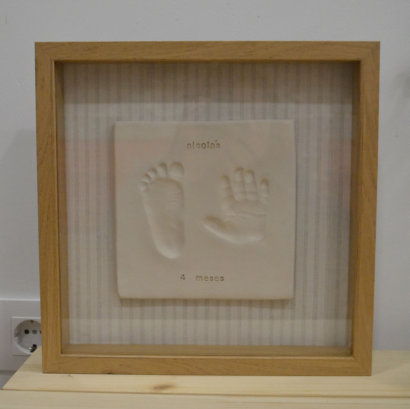 Un recuerdo precioso de tú bebé y también un detalle para unos papás recién estrenados. Las huellas de tu bebé enmarcadas para siempre en una placa de cerámica de 25x25cm. Cerámica blanca en la que se estampan la manita y el pie del bebé y se añade su nombre y fecha.